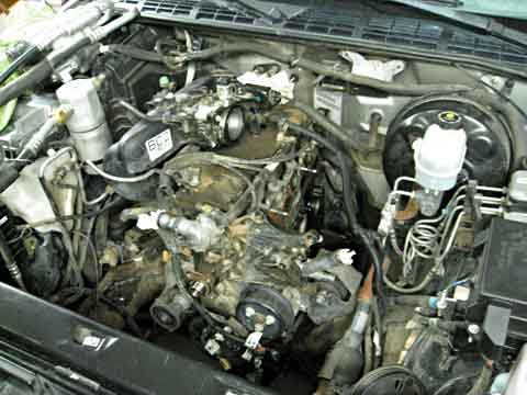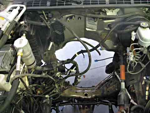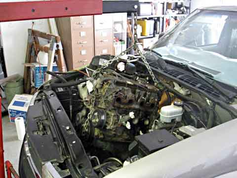 I bought a Makita angle grinder at Home Depot. This particular one had a promotional deal where they include a diamond wheel as well as the normal abrasive one. It should do a good job cleaning up my welds. Over the next couple of days I ordered my main drive motor, an Advanced DC Motors ADC FB1-4001A from EV America, along with some monitoring gages, and a kit which allows me to tip up the bed (like a dump truck) to allow access to the batteries. I then ordered a transmission to motor adapter from Electro Automotive. I will probably order most of the remaining parts from EV Source, as they have been far more responsive than the others, and their prices are quite good. Raw Steel Stock 6/20/08 I did a preliminary design of my battery boxes and estimated my steel requirements. Steel has gotten really expensive lately! The clerk at Prescott Steel said it had gone up 60% since the start of the year! I bought about $200 of angle iron, strap iron, and square tubing. My ladder rack did a fine job of getting the 20 foot lengths home. Now that I have my steel, I was able to take off the rack, at least until the conversion is over. I used my engine hoist to hold one end of the rack, while I walked the other off the truck, pushing the hoist along as I went. I was able to remove a few bolts and fold the stanchions flat and lean the rack against the side wall of the motor home garage (inside). I also removed the tool box. It is now just a pickup truck. I need to actually receive some of my parts before I start pulling all vestiges of the gasoline engine, radiator, exhaust system, and fuel system, etc. Soon now! I'm on my way! The Realities of Buying EV Parts 6/25/08 OK, now I am getting frustrated! I have placed orders with 3 different companies who sell EV conversion parts. One of them has been very responsive, always returning my emails within a few minutes. I have also received some items from them. The other two apparently do not want my business. It is almost a week now and they have not responded to my order. I have to talk to them or communicate by email in order to pay them. I have called and been told someone would get "right back" to me, but it has not happened. I wish the first vendor carried all the equipment I need! I finally got to talk to a "real person" at the 2nd vendor and I got my parts on order from his company. The next day I also received a call from a lady at the 3rd company saying someone would get with me soon. 7/2/08 I never heard back from company 3, so emailed them to cancel my efforts at ordering parts from them. I emailed and called a company in Canada and ordered the transmission adapter and motor mount hardware. They have them in stock and will ship immediately. By the 4th I had confirmation that they truly did ship. Hopefully, I will now start getting some parts to allow me to start the conversion "for real". 7/10/08 I received the transmission adapter today, along with the front motor mount parts. It all looks good. Destruction! 7/11/08 I started disassembling the