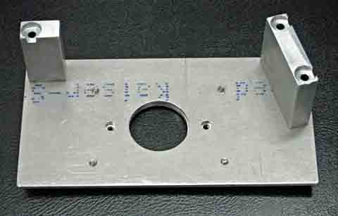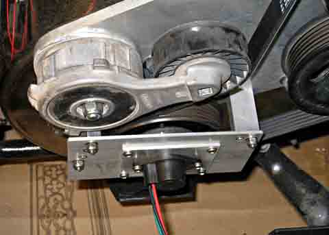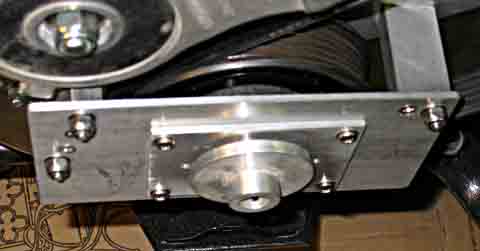 Motor Speed Sensor Mounting My next project was to mount the motor speed sensor. This is a round magnet that mounts on the motor shaft surrounded by a sensor housing. Since the drive pulley for the air conditioning and the power steering is already mounted on this shaft, I need to extend the shaft and make a bracket to hold the sensor beyond the pulley. I decided to use a flat plate mounted on spacer blocks. The alignment between the shaft and the sensor housing is critical. There is about 0.050 total clearance between the magnet and the housing. This means that a .025 misalignment will cause the magnet to scrape the housing. My tolerances are much tighter. I figure that I should allow a maximum of .010 misalignment. My design was a two configuration one. I
