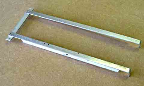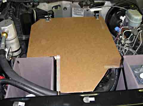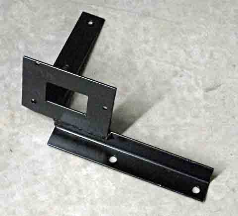 I needed to tackle all the miscellaneous mounting tasks required for the many electronics units, the controller cooling system, the power brake vacuum supply, the motor speed sensor, etc. I chose these tasks next. Main Electronics Board Hinges First I wanted to finalize the location and mounting technique for the main electronics mounting board. I did several paper templates, and after firming up the design, I made a stiff cardboard one. I determined the height I needed for proper clearance both above and below this board. I did a rough design of the hinges. These all allowed me to determine exactly where I needed to mount the hinges. For a design I chose to have a "double shear" style of hinge. A simple bolted joint between two members, one fixed and the other movable, would have worked, but not been nearly as stable. I also decided to not allow a threaded bolt to be the pivot, with the threads acting as part of the pivot. My solution here was to use steel tubes as the pivots. These will be held in place using a smaller bolt through the center. The fixed hinges were made by welding a 1 inch angle to
