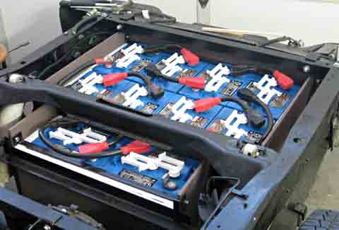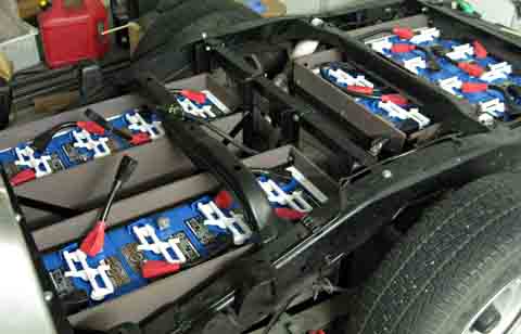 The arrival of my batteries yesterday allowed me to concentrate my efforts on their installation and inter-connections. The batteries I chose are US Battery model US-145XC. The local distributor for US Battery is Interstate Battery who sells the exact same battery as their part U-2400. There are a number of deep cycle battery models with the same length and width. The height varies with capacity. This is a 251 Amp hour battery, and is the highest power battery available with this footprint. Battery Mounting and Wiring Requirements I had several requirements for the batteries, their mounting, and their connection: 1. The batteries had to be restrained! I have seen writeups of a number of conversions where the batteries are just sitting loose in a box. This is not satisfactory to me. All my batteries are restrained. 2. The battery boxes and their mounting had to be strong enough to survive an accident without tearing loose. I ran some strength calculations and beefed up several members for added strength. 3. The batteries had to be protected from road spray and debris. All batteries are contained in boxes with solid liners, and a protective sheet of neoprene is positioned over each battery box. 4. The batteries had to be arranged to prevent any two points that are close together from having any higher voltage than absolutely required. Each of my battery boxes is physically separated from the others and each is arranged to keep the higher voltage potentials apart from each other. 5. All connections that could be insulated would be insulated. I use insulating boots over every battery terminal, and plan to do so as much as possible over every connection to other hardware. 6. All cables in the battery system must have additional insulation and physical protection whenever they run from place to place in the chassis outside the battery boxes or the electronics mounting board. All my exposed cables are enclosed in either heavy vinyl tubing or in split loom. 7. All cables must be physically restrained by cable clamps or other means on all long runs. I have included numerous cable clamps to assure the cables cannot move enough to be damaged or cause damage. I think I have meet all these requirements in my