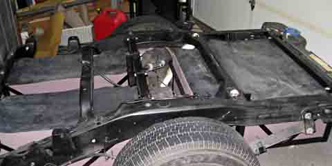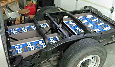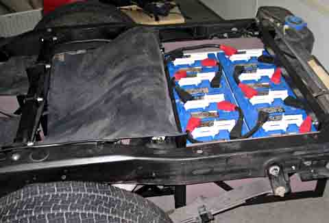 This is my progress through October 13, 2008 Neoprene Battery Covers Addendum of Friday October 17, 2008 I finished the battery project today by installing protective neoprene battery covers. There are several possible occurances which could damage an unprotected battery. Even though I used insulating boots on all the terminals, it is conceivable that a dropped tool could still contact the terminals under the boots. Road debris and other contamination can cause an electrical leak causing the batteries to slowly discharge. Road spray or other water can do the same. A sheet of neoprene over the batteries will protect against all of these possibilities, and help keep the batteries clean. In addition, the extra layer of neoprene will improve safety by limiting possible exposure to voltages any higher than occur in the single battery box that might be uncovered at any given time. I purchased a 3 foot by 6 foot piece of sheet neoprene