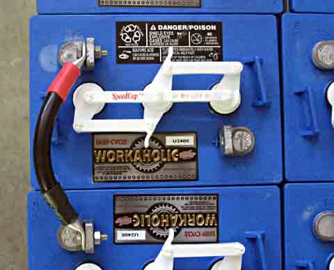 Wiring Difficulties I had specified "L" terminals on the batteries, as the general consensus is that they provide the most reliable high current connections as needed in an EV. The orientation of these terminals caused me some real problems. The connecting tabs of the terminals are pretty much in direct line with the end battery cap. As I need access to all the caps to periodically check and add water, the cables must clear them. I tried without success laying out the batteries several different ways to try to make clear wiring paths. My final solution was to install the batteries in an