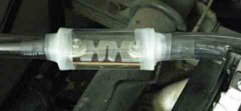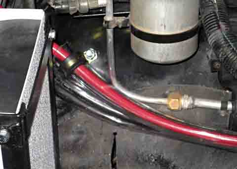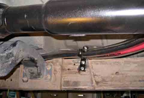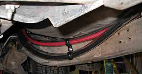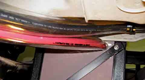 Long Cables along the Frame After completing the battery interconnects, I measured for the cables going forward to the hood area and cut both cables and 1 inch vinyl. tubing to the correct lengths. The vinyl tubing is for mechanical protection of the cables where they run through the truck chassis without other protection. I had quite a time pulling the cable through the tubing. The longer length was over 13 feet, and the vinyl cable insulation tends to stick to the vinyl tubing. That, and the fact that the tubing was somewhat flattened by having spent most of its life rolled tightly on a reel, made it even more difficult. Earlier, in trying to determine the best way to bend the lugs, and to see just how far I could bend them, I had spoiled several by opening cracks during forming. I now utilized a couple of these scrap lugs. After cutting them down somewhat for better clearance, I crimped one to each cable. I ran a nylon cord through the vinyl tubing and tied it to the hole in the lug. By clamping the cord in my vise, I was able to pull on the tubing and work it gradually over the cable. I then installed a cable into each 4-battery box,