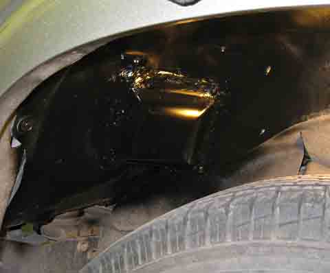 Closing the Fender Well Hole Before I am ready to put the batteries in the front boxes, I must do something I have been very successfully putting off for several weeks- patching the hole in the fender well I made to allow more room for the driver side battery box. It is a roughly triangular shape hole with the sharp corner of the box protruding. I bought a formed steel fence post cap to cover this hole. I spaced the cap 3/4 inch out from the box with a small