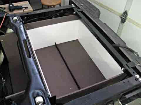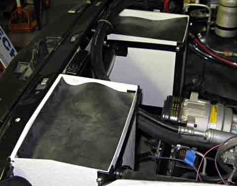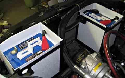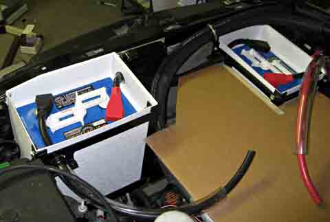 I originally used 3/8- plywood for the side panels of the under-hood batteries, like all the other battery boxes. As I had not yet decided to use the styrofoam insulation around my batteries at that time, it turned out that there was not enough room for it, so I redesigned the battery box panels. I made all new side panels for the two front battery boxes. Some of these were made of the same 3/8- plywood I used on all the other battery boxes, and some were 1/8 in fiberglass reinforced plastic panels. I mixed and matched these to provide the proper inside dimensions for a snug fitting battery in each box after installing panels of styrofoam sheet inside the liners. All the cables entering or exiting these boxes are