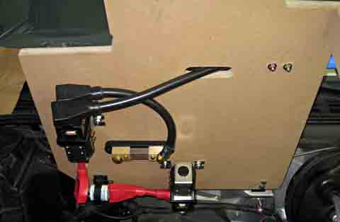 It is now almost Thanksgiving and I am back after spending a wonderful week with family in California. Board Modification and Controller Installation I had originally planned to run the motor cables over the top of the electronics board and down at the firewall. Reading the controller manual I found they recommend keeping the signal wires and the power cables a foot apart. Most of my signal wires run along the rear of the board along the firewall. To even approach this separation, I need to pass the motor cables down through the board right next to the controller. I removed the electronics board and removed all the components and wiring. I then enlarged the pass through hole in the board to accommodate two more power cables. I also enlarged a small hole I use for low current wires to pass through the board. After touch-up painting, and installing the controller mounting screws, I re-mounted all the components and wiring, and installed the board back in the truck. After mounting the controller and hairball, I made my