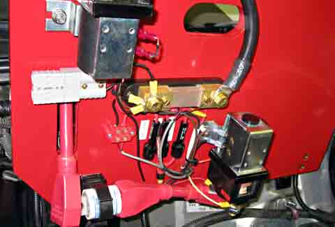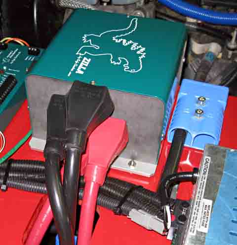 Controller Cooling System The Zilla is a liquid cooled controller. To this end I have installed a recirculating pump and a small radiator. I needed to connect flexible vinyl tubing between all these parts. In addition I included a squeeze bulb to use for priming the system. After connecting the hoses, I gradually added an antifreeze and distilled water mix to the radiator. I then pumped the bulb to force the solution all through the system, frequently adding coolant to keep the radiator full. It took a while, but I finally got all the major air bubbles out, with only a fine foam at some of the high points. I now started the pump which continued to circulate the fluid gradually letting the remaining air collect in the radiator and rise to the reservoir. Pre-operation Test Before applying full voltage and current to the system, I wanted to check that everything is functional while maintaining full safety. I pulled one of the motor leads from the controller and connected a 60 watt light bulb between the controller and the motor. For safety's sake, to turn on the controller, you must turn on the ignition, then activate the starter position for a couple seconds. Once activated, the power is applied, the throttle is active, and you can then drive. I tried to energize the system to verify that the bulb would light. My first several tries failed. I then remembered that to activate the starter, you must fully depress the clutch pedal. Once I did that, there was a clunk of the second contactor and as I pressed the accelerator, the light bulb lit. The harder I pressed, the brighter the bulb. Test OK! FIRST TEST DRIVE !!! (December 1, 2008 3:20PM) I was now ready to try it out. To memorialize this historic event, I set up my camcorder on a tripod in the garage and taped my first drive. I got in the truck and remembered to press the clutch while going through the ignition on - start switch sequence. Then I put it in reverse and slowly backed out of the garage. I drove around the block and pulled back into my garage. It was successful from the point that I made it out, around, and back safely. The downside was that my performance was abysmal. I was never able to draw more than about 100 amps, and had to shift down to first to make it up the hill on the block below mine and again up the driveway. I then reviewed the settings I programmed into the controller against a sample in the manual and realized I had been far too conservative in a couple of my settings. I changed these settings and the following morning I drove it again. This time it was much more satisfying. It is certainly no speed demon, but has almost reasonable performance. I was now able to pull up to about 300 amps, with the corresponding improvement in performance. I will continue to fine tune the parameters over time. Note of December 3: