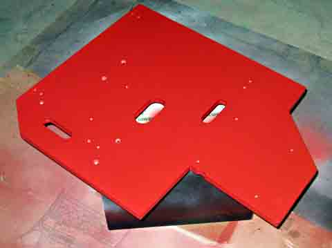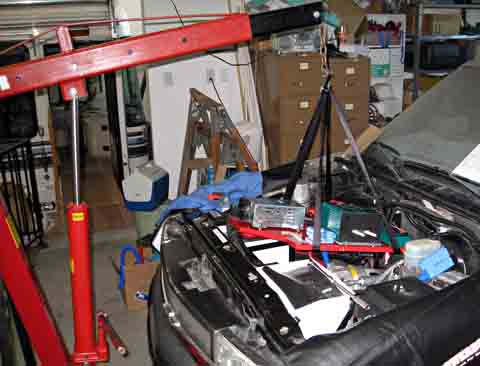 Electronics Board Hinge Modifications I knew all along that the hairball clearance to the windshield wiper motor was going to be a limiting factor on how high I could raise the electronics board. After completing all the re-installation and the addition of the controller and hairball, I tried lifting the board. I was quite disappointed in the reduced amount of lift I could now get. I went back to my CAD layouts, entering the exact location of the hairball and the windshield wiper motor, and experimented with moving the hinge point. I fount that by moving the hinge point forward 2 inches and up 1/2 inch, the board would lift about 50% higher. It probably will lift more than the open hood will allow. I designed a pair of adapters that bolt to the original