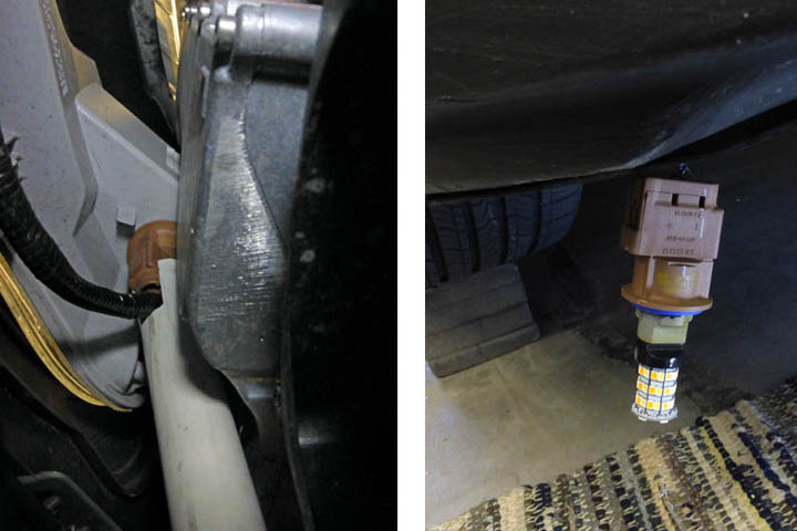 On the left you can see the tool on the light socket. The right shows the socket hanging down and the LED bulb installed.