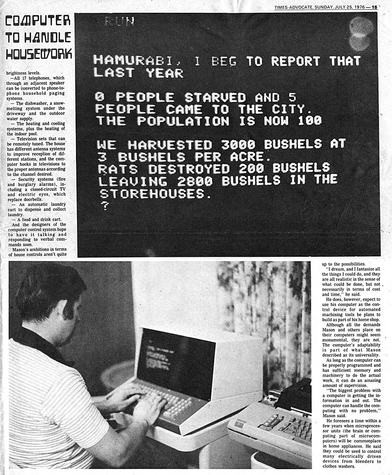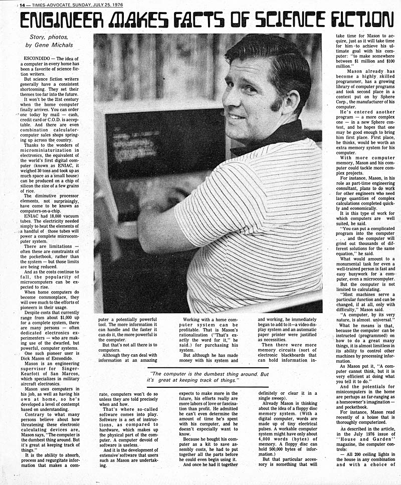 This is the article the Escondido newspaper, the Daily Times Advocate published in their Sunday supplement on July 25, 1976: