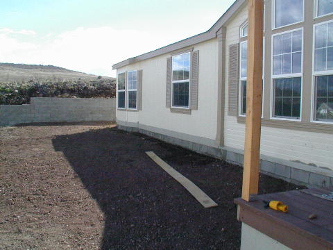 I was at the house just after 8:00 masking all my switch and outlet boxes. Shortly, Mike the plumber showed up. He had been there the previous evening to hopefully fix the slow leak in his new gas run. He had cut out a foot square section of the brand new drywall to access one of his fittings in the front of the RV garage. He opened a joint there and pressurized each half. Both held pressure! The leak was at the joint he opened. Mike is a very slender fellow. He said he had tightened the joint as tight as he could while standing at the top of a ladder. He is getting his boss, who is much stronger, to come and complete this joint. They will patch the drywall and paint it when done. About this time, Steve drove up in a skip loader and started doing the final grading around the house. Then Tom and Scott along with several of the workers showed up. They started forming for the extended patio and a landing for one of the sets of steps from our front deck. The painters arrived. It was 10:28. They were actually early! One of them started masking windows and doors. I left for a while and when I returned, the painter was just starting to prime coat the shop. With his airless spray gun, he was painting about an 18 inch swath. It went very fast! Tom and Scott started putting the skirting around the bottom of the house. I got a call from Betty saying the locksets had come in to Foxworth Galbraith. I picked them up. They actually had levers on both sides this time! By the time I left around the end of the day: