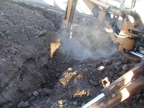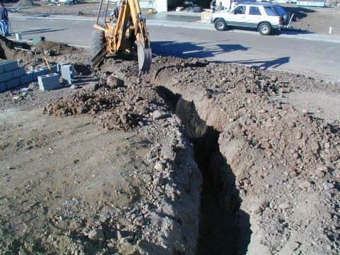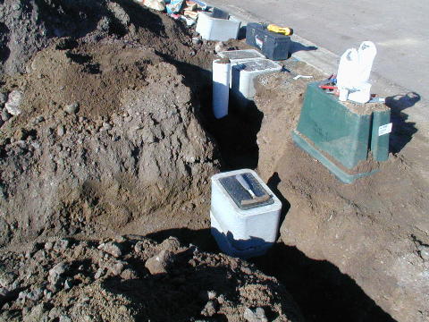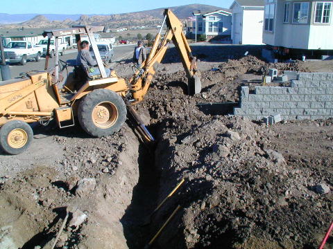 Steve dug a trench along the west side of the RV driveway for the water line to the RV garage. The line from the meter went to a shutoff valve just behind the meter (This is in addition to the one in the meter housing.) From there it runs to the pressure regulator and then to a tee. One side of the tee feeds the house, the other has another shutoff valve and feeds the RV garage hose bibs. The regulator, tee, and RV shutoff valve are at the bottom of a cement water meter housing. The shutoff valve just after the meter is in a large PVC pipe which extends up to the surface. Sunday, Jan. 12