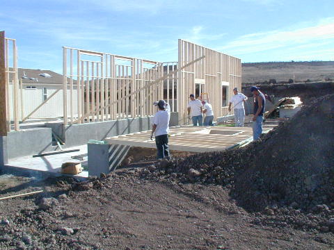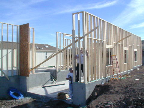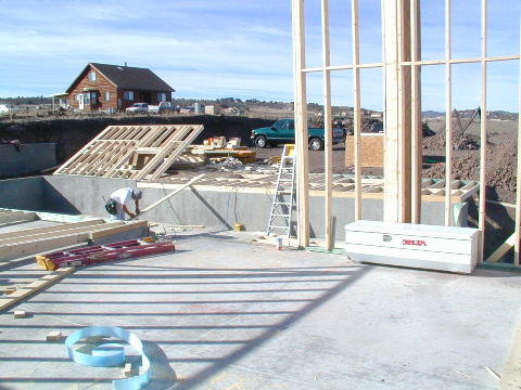 They start by matching "green board" to the footings and drilling holes for all the J-bolts and any conduits coming from the floor. They then mark the stud locations on both this board and the top plate. Studs are cut to the right length and the wall is nailed together. Of course windows and doors make the process slightly more complex, but the first walls had none. Before I left in the early afternoon, the rear car garage wall and the two short walls on each side of the door were all up and braced to be plumb and true. The 4 x 12 laminated beam header was lifted up to the top of the garage door and nailed in. They were in the process of fitting the last of the green boards around the RV garage and cutting a number of studs to build these walls as I left. Tuesday, Jan. 14