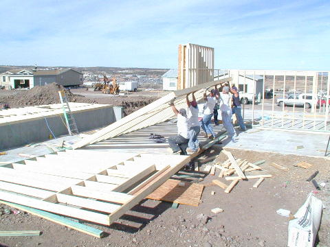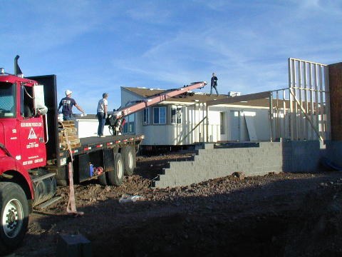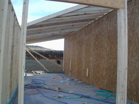 These wall sections of 2 x 6 studs a little over 12 feet high and about 16 feet long, some with window headers, are heavy! When all the sections were up, tied to each other and braced, Scotty was very anxious to get some "shear panels" in place to make them very stable. The entire RV garage is "sheared" using 1/2 inch OSB (chipboard). Once this is in place, there is virtually no movement of the wall along its length. I mentioned that the walls were a little over 12 feet high. These walls are built on a block wall that is about 42 inches high. The total floor to ceiling height of the RV garage is going to be 16 feet, 1 inch in the front, a little less in the rear as the floor slopes slightly toward the front for drainage. Wednesday, Jan 15