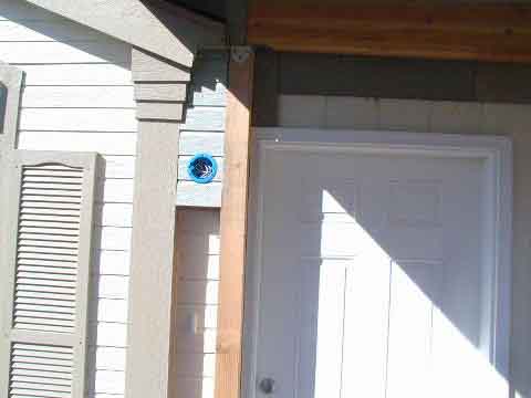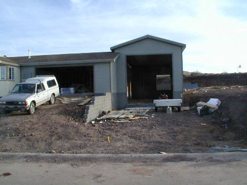 I headed out to the house this morning fairly late. When I got there, Scotty's (the framer) truck and the construction trailer were in front of the house. After a while, Scotty and his boss, Robert showed up with a truckful of lumber. They are building the landing in the rear of the RV garage today. While Scotty built the landing and stairs to it, I started tearing out wood where the front deck joined to the house. The facia board and boxed-in roof overhang had been cut at the edge of the porch with just a simple trim piece nailed in to close it off. It was really ugly. Also, after adding a 4 x 4 post to support the deck structure, the front door light was buried between two posts. I removed a lot of the pieces that really did not belong, and replaced them with a piece of siding material that bridged the gap between the two posts. A couple of small pieces closed in the top and bottom. I mounted the electrical box in the new piece of siding which is flush with the front of the posts. I think it looks much better and will certainly provide more light when the fixture is mounted. Sometime since yesterday late afternoon and now, the two shop windows showed up. The 3 side windows for the RV garage are still missing. Scotty is scheduled to come Sunday (to make up for a couple days off this week) to install doors and windows. They installed a 2 foot long 1/4 inch steel strap on the west front of the RV garage this afternoon. It ties the concrete filled blocks securely to the wooden structure above. The inspector is coming again Monday to buy off the added straps on the shop rafters and this front tie-down strap. Hopefully drywall can then be done. Saturday, Feb. 15