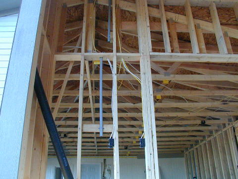 I have now completed installing all the wiring (except the panels and their feeds) in the RV garage, my shop, and the garage. It has been a major chore. I installed about 1400 feet of 12 gauge romex (2 and 3 conductor), about 100 feet of 10 gauge 3 wire, and 80 feet of 6 gauge 3 wire romex. I also strung over 200 feet of bell wire for the garage door controls. While wiring the shop I was questioning my decision to have the ceiling slope like the roof. I figured it would give me more "space" with the higher ceiling. What I didn't count on was that by putting the ceiling on the bottom of the roof joists, every wire needed to pass through drilled holes everywhere! There is no open space in the trusses (no trusses) as in the garages. There are a lot of wires in the shop, therefore a lot of holes in the wall studs, top plates, and ceiling joists! They all got drilled, and the wires all got strung. The ground wires have been connected in all boxes with more than one cable, and the neutrals have been connected in all the switch boxes. I don't know how to get any more ready. The electrician is meeting me at the house tomorrow morning. In an estimated two to three hundred 7/8 diameter holes I drilled, I hit one nail. In about a dozen 1 1/2 in. diameter holes, I hit 3! The larger holes were for my various runs of 1 inch conduit running from the patch panel area in the garage to the shop and RV garage. There are also a couple that will serve both sides of the wall between the RV garage and the shop and the garage. This conduit allows me to string TV, phone, computer network wires, and anything else that may be developed in the coming years throughout the area. I changed my plans on this conduit. I had been going to run several dedicated runs from the patch panel to selected locations. One of the problems I encountered was the much higher RV garage ceiling. To get the conduit to the far RV garage wall would require too many bends to be able to fish the wire later. I ended up running one dedicated run to the near corner of my shop. I ran another run to the wall between the garage and the RV garage. In the same area I ran a short length straight down that will be available to both the garages. Also from that area I ran one up and over part of the RV garage ceiling to an area near the center of the building. From that same area I ran one over and down the wall near the RV utilities and another one to the back of the RV / shop wall for access from either room. I will have a removable cover over each common area so I can fish wires from almost anywhere to anywhere. As we have no power to the site yet, doing some of the drilling and sawing was a challenge. I drilled the majority of the 7/8 holes with my Black and Decker 18 volt "Firestorm" drill David gave me. It will drill through about 3 feet of wood (about 24 thicknesses of 2 inch lumber) on a battery charge, and I have two batteries. Several days I started recharging the first battery when it was used up using a small inverter and my emergency car starter pack, which is a portable case with a battery and jumper cables. I often had most of a 3 hour charge in by the time the second battery was discharged. The other thing I did quite a bit of for my sabre saw and an AC electric drill was to use the same battery pack and a 750 watt inverter, newly bought from Home Depot. This setup worked beautifully, and even with fairly heavy use several days, I never discharged the battery to where it stopped working. This setup was invaluable for the 1 1/2 dia. holes. My B & D drill would die after about 2 thicknesses of wood. The AC drill had more power and just kept spinning! (It would shut down briefly if I overloaded it, which happened often!).) The electrician is meeting me at the house first thing tomorrow morning. We will be installing the sub-panel in the corner of my shop. I have wires hanging down where it will go that will utilize 16 additional circuits. Monday, Feb. 10