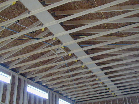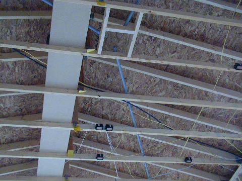 Yesterday I was talking to Tom, one of Steve's foremen and mentioned that I had screwed the cat-walk down to each truss. He asked if I checked the dimensions from truss to truss before doing that. (I had not.) During drywalling, they quite often pull the trusses to align to the edge of the drywall. I have effectively blocked that ability. I found I could set my 12 foot stepladder on the new landing, with the top of the ladder actually extending just above the ceiling. I took my drill, tape measure and a pocketful of screws up to the attic. Starting at one end, I measured the distance between spans. A couple were off by over an inch, with larger cumulative errors. One truss at a time, I removed any screws, flexed the truss to the correct spacing, and re-screwed it. When I finished, all were set at 24 inches within 1/8 inch, both center to center and cumulative. The drywall should now align OK. It has been sunny today, the rain ended last night. We had about 2.6 inches the last 3 days. Even though it is clear, there is a lot of mud. It will take several days for that to dry out. Enough for this edition. I have posted photos on-line at: http://members.isp01.net/rmason/statusreports.html Till next time, Dick