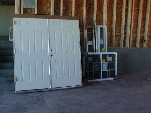 As soon as the workers saw what I was doing, one of them crawled up in the trusses and helped locate the boards. It only took about 10 minutes to place the garage boards. As soon as they discovered I was putting the rest of the boards in the attic of the RV garage, two of them went in the house and came out with my 12 foot stepladder. Before I knew what was happening, Felix had crawled up into the trusses (16 feet up!). With David holding the ladder, and Felix in the trusses, it was a simple matter for me to bring the boards one at a time, climb up the ladder with them and hand them up to Felix. I would then climb up and drive screws into the trusses to secure the boards. In about 30 minutes this cat-walk was installed. As I was preparing to leave, a truck pulled up with the doors and some of the windows. After unloading them, I measured the setback of the lockset holes, they are also 2 3/8. I can now order the locksets. On my way home, I went by Foxworth Galbraith and did just that. They should be in Monday. Friday, Feb. 14