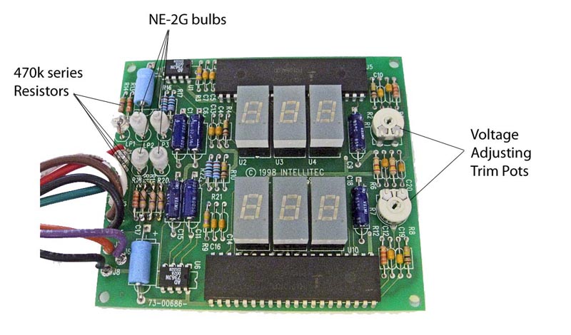 AC Power Monitor Foretravel supplies an AC monitor panel in all their motorhomes. This panel contains two digital AC voltmeters and two sets of neon bulbs to verify correct connections to the campground pedestal. In normal usage, where all connections are correct, each bank displays 2 green lights and no red lights. By the time the rig was about 2 1/2 years old, the green neon lights were flickering fairly badly, and would not light at all at low line voltages. Foretravel replaced the monitor on warranty, but warned that "they all tend to do that". Not wanting to have them fail again, I opened the monitor and replaced the light bulb series resistors with ones 10 times the resistance. If I remember correctly, they were 47k and I changed them to 470k. This reduced the intensity somewhat, but they are still plenty bright. Their life should now be extended by a large factor. It is now over two years after making this change and the lights are still rock solid. Note of 3/25/12 It
