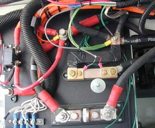 Electrical MonitorI am an engineer, and nothing bothers me more than the inability to know what is happening in any of the systems. Probably the system I had the least information on was the 12 volt electrical system. The only information I had on the battery usage was the very coarse indicators on the charger panel. The LED's here are in 3/4 volt increments and 3 to 100 amp increments. There was no indicator of actual battery usage. At an FMCA convention I looked at all the electrical component vendors to see what was available in electrical system monitoring units. There were a couple small meters that would have done the job by displaying volts, amps and amp-hours. However I saw one unit that seemed to be built to a much higher standard (and price). It is the Emon II produced by Ample Power Products, a company specializing mainly in marine power systems.. This monitor reads voltage from either battery system, house battery amps in or out, battery temperature, amp hours used or remaining, and a fuel type guage that indicates how full the battery is. It is set up to operate with solar panels and with an optional 3 stage regulator for the engine alternator. It will display any single item, scan your selected list of readings, or quickly select any of the 4 most commonly wanted values. It keeps many totals and allows the setting of a number of alarms. There is a computer interface and software to allow the keeping of data on a laptop computer. The battery level circuitry tracks incoming and outgoing amp-hours. It processes this data through an equation known as Peukert's Equation. This takes into consideration the rate of discharge. A battery will produce far fewer amp-hours at a high rate of discharge than at a low rate. This is all compensated for in this instrument. Installation consisted of mounting the instrument, installing a current measuring shunt, and running quite a few wires to the two battery banks and the 12 volt panel in the main cargo bay. I got quite familiar with the way wires are run fore and aft in the center of the coach over the various bays. I now can keep very close track of my battery usage and level of recharge when I am dry camping. One thing tht really suprised me was how slowly the batteries recharge while driving. An all day drive will only replace about 20 amp hours of use. The charger in the Prosine inverter is very much faster. This is a very high quality instrument!