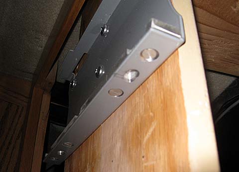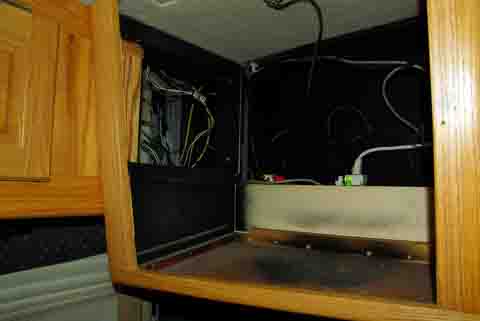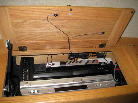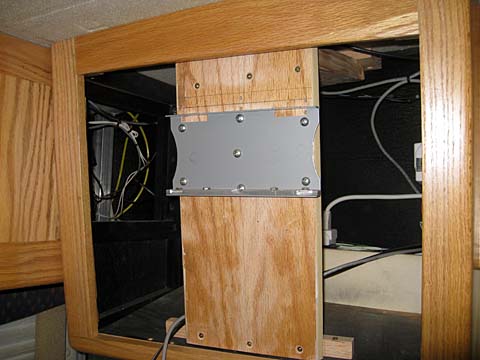 I had to remove the TV to gain access to the area where the original connection box was mounted. While it was off, I decided to make a couple of minor improvements in that area. When I am mounting the TV, the audio and video cables are fairly easy to attach, as they are quite long. The TV antenna cable is not so long and it is a real problem to hold the TV high enough to attach it. The power cord is difficult also, as I have to plug it in far away from the TV, and that makes the TV very hard to hold. I solved the problem by mounting a short length of 1/2 inch angle iron to the bottom of the TV cabinet. This allows me to temporarily hang the TV from this angle while attaching the various cables. Once the cable are all attached, I lift the TV off this angle and hang if from its regular mount. As I drive, once in a while I can hear a dull ratteling in the TV cabinet. I think this is the cables bouncing on the wooden floor of the cabinet. While the TV was out, I lined the bottom of the cabinet with carpet. This should eliminate the rattle.
