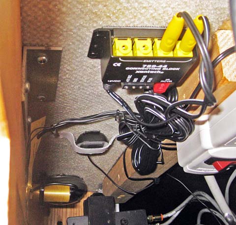 My Foretravel came stock with an infrared remote control extender. This consisted of a small IR receiver mounted on the surface of the center front cabinet above the door, a connector block, and a pair of emitters which were fastened to the receivers inside the closed cabinet. In operation, the receiver would pick up the remot control signals and relay them to the emitters, which in turn would activate the controlled items. Unfortunately, this system deterioated with time, to the point that it did not work at all for the last couple of years. I would just open the door to the equipment cabinet when I wanted to watch satellite TV, or use the VCR/DVD player.I decided it was time to fix this, so I went on line, and after a bit of research, selected a complete new system from the same manufacturer as the original equipment. In the time since my motor home was made, the company has made a number of new products to solve some of the developing problems. The system is designed for home stereo systems where the equipment is housed in cabinets, just like my situation. The system I selected is designed to reject interference from LCD TV's and compact fluorescents (CFL) bulbs. My lights are not CFL's, but are very similar as the balasts run at a very high frequency, just like CFL's. The kit I bought included the receiver module, the connector block, a power supply, and 4 emitters. The receiver is larger than my old one, mounting in a 3/4 inch hole instead of the 1/2 inch for the original. Other than that, the kit is very similar to my original parts. The only functional change I made was to use the included power supply to provide the 12 volt power for the unit. Originally the unit was wired in to the house 12 volt system. I worried about that as the voltage can reach 14 1/2 volts during charging and the manufacturer specifies a regulated supply between 11.5 and 13.0 volts. The only time I will use the extender is when my TV is on, and as that is 120 volts also, power will be available.