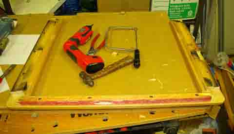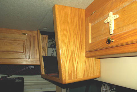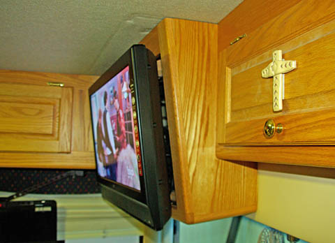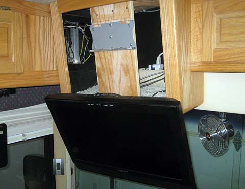 Fortravel delivered my coach with a 20 inch hi-line Panasonic color TV in the front, and a Panasonic 13 inch TV in the bedroom. This has been quite satisfactory over the years with just a couple of problems. Early-on, but not recently, the sound would lose volume for a while. Also there is a periodic color banding, apparantly from magnetic disturbance from the radio speaker just behind it. I don't know why this is just sometimes a problem. The only other problem I have seen is the lower right corner has a somewhat soft focus. The result is it is difficult to read all the satellite guide information. As analog television is going away February 2009 to be replaced with only digital signals, I decided it was time to improve the TV's, front one first. I had the advantage of seeing photos of a number of similar conversions by fellow Foretravel owners. These were all flat panel LCD TV's ranging from 26 inches to 42 inches (diagonal measurement). I decided that I wanted the largest set which would mount on the face of the existing TV cabinet without inhibiting access to any adjacent cupboards. This turned out to be a 26 inch set. I started my on-line research and went around town looking at and measuring TV's of all brands. I looked at quite a few, all of which receive digital channels and will display in high definition resolution. There were several "deal-busters". Obviously it had to fit within the dimensions I had determined were the limits. This ruled out any side speaker units, only bottom speaker sets would qualify. It had to use remote control codes that my DishNetwork remote would recognize. This ruled out several of my otherwise front-runners. Vizio makes a set that seemed to meet all my needs, except that every one I saw just did not have the picture quality of adjacent sets. I initially settled on a particular Sharp unit that Costco carried, then looked up reviews on the Internet. About 60% of the reviews I read complained about inadequate sound volume and quality. I passed on that set. I then homed in on an LG model that had an absolutely beautiful picture. The on-line reviews for this one warned about very high failure rates. I passed again! I finally chose and bought a Sony Bravia TV which passed the review test, the remote compatibility test, the picture quality test, the sound test, and the size test. I am a happy camper. The only negative I have identified for this set so far is that the manual control buttons are on the top of the front frame. I had hoped for ones on the front or right edge. I can easily reach them, but will need to label the front to know what I am pushing. OK, now that I have the TV, I have to figure out what all I need to do the the cabinetry to mount it. If I simply mount it on the front of the existing cabinet without modification, the side cabinet door will not open. I need to cut the existing cabinet down by about 3 1/2 inches. This is enough to easily clear the side cabinet door, but not so much that it exposes space past the side paneling. I have no idea what is involved in removing this cabinet, but if it went in, it has to come out! I removed the front bezel, then removed the TV. Inside the cabinet