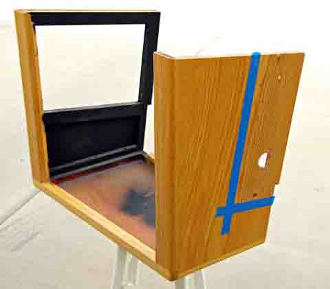 I used some oak shaded wood putty and filled all the joints. This worked much better when I started using masking tape on both sides of the joint, and puttied between them. This not only kept the putty from filling the surounding grain, but also left it high by the thickness of the tape. Upon sanding, the joint was flush, even if there was a little shrinkage. I also cut the top out of the original bezel, which will no longer be used, and used it to fill in the open top of the frame. I thoroughly sanded all faces of the cabinet both to remove most of the original finish, and to smooth up all the newly glued joints. I then applied 3 coats of clear lacquer. This provided a finish I was unable to tell from the original. The modified cabinet re-installed just the reverse of its removal.