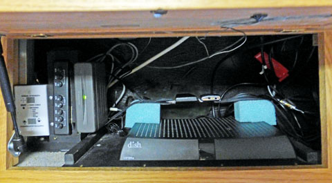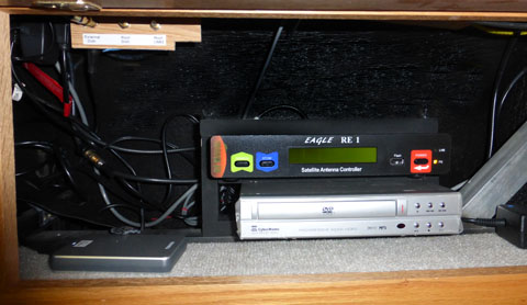 left vertically next to the antenna switch. Yes, that is an automotive seat belt holding the receiver in place with a couple of blue foam blocks to cushion the receiver, and to give the belt a good angle to hold it down. On the right is the adjacent cabinet showing the DVR hard drive at the lower left. It also shows the controller for the rooftop dish and the DVD player. I no longer carry a VCR.