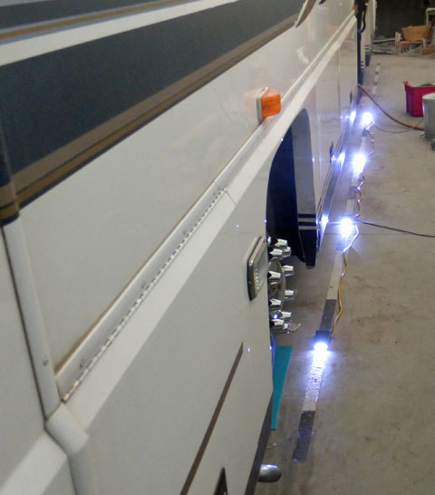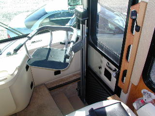 The Ramp: When we moved to Prescott, Arizona in late 2002, we did several things to assure easy access for Betty. The home we "built" is a very nice manufactured home on about a 1/4 acre lot in a manufactured home subdivision. I planned for the home to be lowered and the garage to be raised from the normal heights so the floor levels were equal. On the other side of the garage is our RV garage which has the floor 42 inches lower than that of the house and garage. After getting partially settled, I built a redwood landing which extends the garage floor level about 3 feet into the RV garage. From this I built a sturdy wooden ramp which bridges the gap from the landing to the motorhome floor (with the sliding floor in the extended position). An alternating stripe of black and white duct tape on the garage floor allows me to park the rig very accurately in the same position each time. I can easily get within 2 inches in each direction. The ramp will work with about a 6 inch variation. Betty can now walk all the way from the house into the rig using her walker with no outside assistance. Subsequent Changes I later modified this setup slightly, as I realized that the air solenoid for the floor slide was always energized when the floor is extended. I was also concerned about the safety ramifications if the sliding floor were to somehow retract with the ramp resting on it. To eliminate these concerns, I made a floor member from a piece of plywood that lays on the guides for the retracted floor slide and supports the ramp. This eliminates the constant current draw and provides a solid walking surface into the rig, and it will prevent the floor slide from extending, even if the switch is turned to do so. I also made changes in the duct tape parking guide system. As I back into the motorhome garage, the sun often hits directly on my driver's side mirror and makes seeing the tape very difficult. First, I bought a length of "rope light" from Sam's Club. I placed this in a wooden guide along the top of the tape. I used this for several years, but it was still very hard to see under bright outside conditions. I finally bought some LED strobe lights on Ebay, and placed several of the lights on the tape. This works great! I can see the flashing lights continuously from the street all the way back into the garage, even if I have bright sun directly on a dirty side mirror.