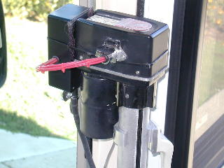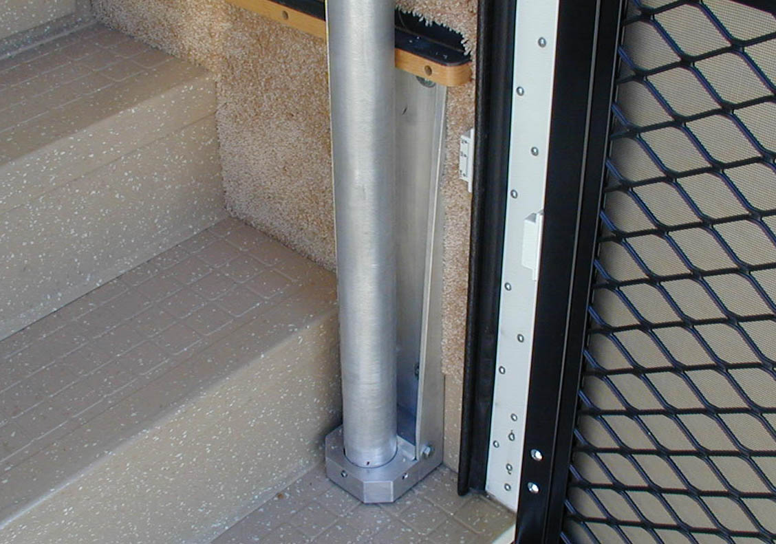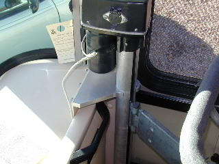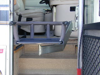 The Lift: The lift we chose was a Lectra-aid electric chair lift, originally designed to be mounted on the exterior wall of the motorhome, just behind the door. In operation a two piece hinged bracket is pinned to a pivot point on the lift, a chair is placed into the outer pivot of the brackets. The person using the lift sits in the chair and is raised. When fully up, the multiple pivot points of the bracket allow the chair to be passed through the standard width door where the rider can stand inside on the floor. This is how I mounted the lift on our two previous motorhomes. On our new Foretravel I did not want to mount the lift on the outside for two reasons: First I did not want to scar the beautiful outside of our new coach. Second, as the new unit is already 102 inches wide, the added 6 inches of the lift when mounted on the outside would make driving the rig dangerous, as well as being illegal in every state. After making many measurements, I determined