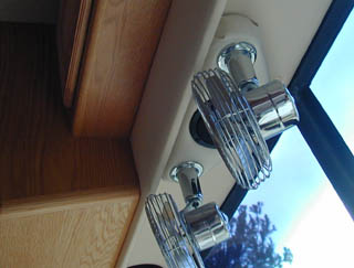 Windshield fans: My two previous motorhomes have had fans which could be directed at either the windshield or at the driver and passenger. I really like having the flow of air when it is just a little warm. Our Foretravel had no such fans. I bought a pair of two speed fans at Camping World. If I were to have mounted these directly on the overhead panel on either side of the CB speaker, they would not have cleared the vertical panel inside the windshield opening. I decided to make a mounting block that would both lower the fans to the right height and allow me to mount everything without damaging the vinyl covering of the overhead panel. I removed the CB Speaker. I then made a wooden ring that mounted exactly in the same footprint and used the same screw holes as the speaker. I made a wooden block several inches thick that had a mounting for the CB speaker and had two ears to mount the fans. I bought some foam padding and off-white vinyl at an upholstery shop. I covered the block with the vinyl, mounted the fans, screwed the assembly to the ring, then mounted the speaker. I ran a number of wires from under the dash