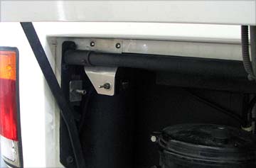 Added Tow Bar Clearance I use a Roadmaster Falcon towbar which mounts to the motorhome receiver. For when I am not towing, there is a ¼ inch thick tab on the bar with two holes, one of which pins through holes in a two plate bracket welded to the towbar base. This holds the bar in a horizontal position for storage. Unfortunately, with the bar in the storage position, the engine access door hits it as you start to open it. I notice that at Foretravel, the first thing the techs do before opening the rear door is to un-pin any tow bar and rest it on the floor. I made some measurements and found that I would only have to extend