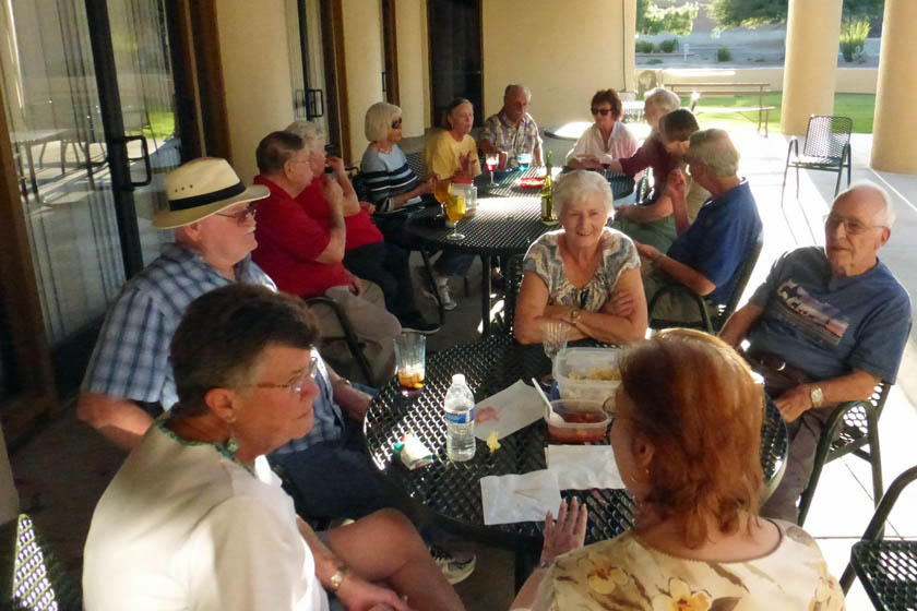 Phyllis and Marilyn and Tony, April, and Linda relax during our 2nd night's Happy Hour.