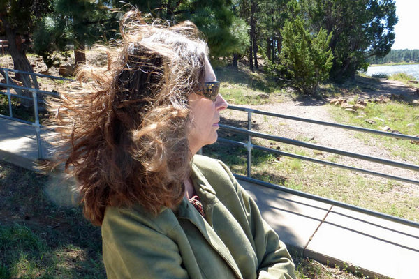 As we were watching the lake, the wind played havoc with Shirley's hair.