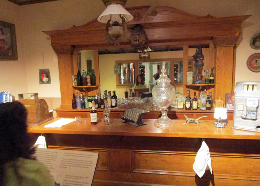 The saloon has a couple of slot machines on the bar and a large glass container with the word Whiskey embossed in the middle.