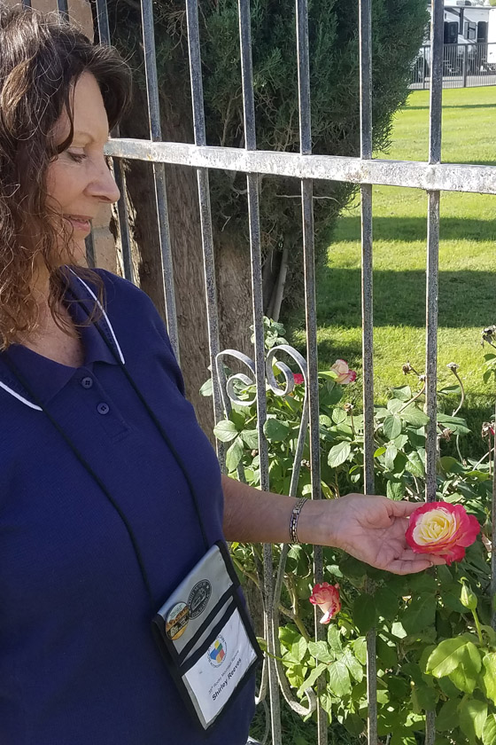 rose bushes. Here Shirley is admiring a particularly beautiful
