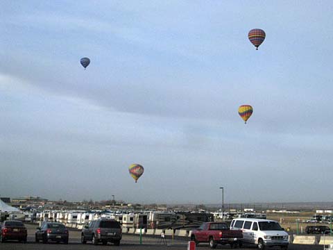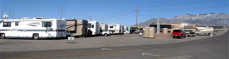 As the time for the convention approached, we were asked if we would work "early security". This would mean going earlier than planned and working during the setup of the convention. The upside was that we would be through working before the convention actually started. I made plans for us to stay in a campground in Grants, NM. where all our members would meet up. The following morning we would all drive the remaining 90 miles to the convention in a caravan. Harry asked me if we could include members of two additional chapters who were also working early security. This raised our total to 13 coaches. This would be reduced to 12 due to a last minute illness. Wednesday, March 17 We left home about 7 AM on our 340 mile trip to Grants and arrived by about 3, after moving our clocks ahead an hour entering New Mexico. Over the next few hours the remainder of the coaches arrived. The day ended with an evening pot luck dinner. Thursday, March 18 Promptly at 9, we departed as a 12 coach caravan and drove the 90 miles to Balloon Fiesta Park in Albuquerque. When we arrived, the parking crew was still laying out the parking areas. Our chapter had signed up to park in the "full generator" area, where generator usage was permitted 24 hours. One our our members is on oxygen, and needed this power. After waiting about an hour, we were directed to park along the outer fence of the park. The full generator area consisted of a small lot just on the outside of the fence and another area just inside the fence.