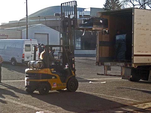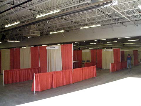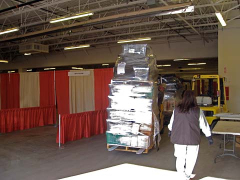 Today's shift was fun! Our duties were at the indoor exhibits. Rosemarie was assigned an entrance door of the main exhibit hall and I was at a large roll up door. During my shift I watched as Camping World emptied 3 semi trailers of fixtures and goods. These were brought in through my door by endless trips of a pair of fork lifts. The Camping World displays were at the far end of our hall and consisted of a full double row of booths. In addition to the Camping World equipment, many smaller vendors set up their booths, mostly using hand carts and wagons. A lot of these smaller vendors entered through Rosemarie's door. With the end of this shift, our duties were complete. It was a most interesting day!