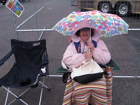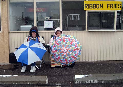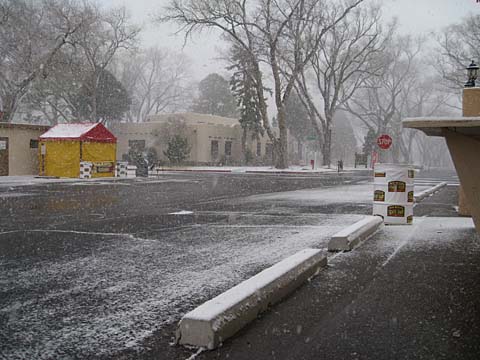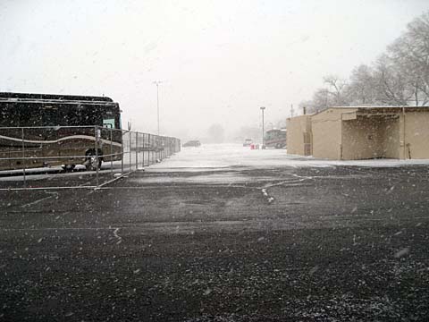 This convention is different from most in that is is held at a split venue. Most of the coach parking along with the evening entertainment is at Balloon Fiesta Park (BFP), while all the exhibits and daytime entertainment are at the county fairgrounds (Expo), about 10 miles south of BFP. Trams run at each facility to take you from area to area. Each facility had a transfer station where a number of highway type buses would take you to the other facility. Friday, March 19 We had signed up for the earliest shift each day. These started at 7 Friday and Saturday, and at 7:30 on Sunday. We met at 6:15 to be driven to the Expo by a van (the buses had not started running yet). We were driven around the various gates where we would be stationed. Our duties were to check that all persons and vehicles had the proper credentials to enter the area, and to redirect those who didn't. Rosemarie and I were given two "gates" across the street from each other. The gates were really continuous lengths of chain link fence. The fence company was supposed to come around 8 and remove panels to create real gates. Around 10, we were still guarding two chain link fences. About 10 minutes after I discussed the futility of this with an FMCA official, we were moved to a real gate, with real traffic. We spent about the final hour of our shift here. Saturday, March 20 We woke up to light snow at BFP, which stopped by the time we went to meet the van at 6:30. It was cold, but dry. We were taken to the same gate where we ended yesterday. About the time we got our chairs set up it started to snow! We moved our chairs against the wall of a concessionaire for protection against the wind. We had dressed very warmly and survived just fine. It was a bit ridiculous though, as no one else was foolish enough to start working in the early morning snow. I think we had about 8 vehicles pass through our gate during our 3 1/2 hour shift.
