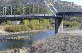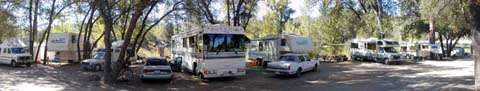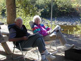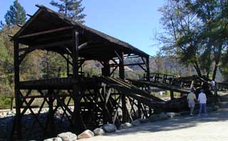 Thursday, Oct. 11 We had only 90 miles to drive today, but WOW, what a 90 miles! Floyd had told us to expect to make about 30 mph. My Silverleaf gage showed we actually made 28.2 mph! The roads were narrow, winding, and largely up or down. We had one section where there was a sign warning of a 13% downgrade ahead, with a 15 mph curve at the bottom! They were right! I love the transmission retarder on our Foretravel! It was a major factor in our decision to buy the unit. Even on the 13% grade, I decelerated if I put the retarder on full! I hardly used my service brakes during the whole drive. Upon reaching camp, you could smell very hot brakes on just about all the other vehicles. We had more trouble getting here than we have had for a long time! Upon reaching Placerville, we totally lost highway 49. We finally, after driving our rig through some very narrow, tourist type 1850's streets, found a sign directing us to highway 50. We knew this crossed 49 so were able to get back OK. We access the campground by crossing the American River over a fairly long single lane bridge. We need to check that it is empty before starting across. There is not much clearance on either side of our rigs! Our site here is nestled among many oak trees, right on the bank of the South Fork of the American River. It is really nice! For the first time this trip, my rooftop satellite antenna is totally blocked. I had to set up my tripod. We had a group over for the A's/Yankees playoff game in the evening. Friday, Oct 12 We went over to the Marshall Gold Discovery State Park. It turns out that we can see the replica of Sutter's Mill from our RV park. It is just across the river. This is where James Marshall discovered gold, starting the largest migration in the US - the 1849 gold rush. Marshall and Sutter were partners in building a saw mill. Just about the time the mill was approaching completion, Marshall picked up a small nugget from the discharge area of the mill. He was not at all convinced it was gold, and had it checked out. It was! In the end, neither Marshall nor Sutter found much gold. Both died essentially broke! We looked through the museum in the park, where they announced a ranger talk at the sawmill at 12:00 and 2:00. It was about 11:30, so after finishing our looking there, we headed over to the mill, just across the street. This mill is a replica, built in 1967 about 500 feet from the original, on higher ground. The original was operated until 1850, and destroyed by high flood waters in 1862. It was totally lost for a period of many years. When it was finally discovered in 1924 there were only mud locked, submerged timbers remaining. Using the original plans discovered in Marshall's notebook, the one remaining photo of the original mill, and the dimensions of the recovered timbers, the replica was built. There is no water to drive it, so it has been motorized for demonstration purposes. We then drove around Coloma, finding Marshall's cabin, a monument built in his honor, and numerous interesting artifacts from the gold rush era. We then headed in to Placerville (about 7 miles) to explore. This evening, we were invited to Mary Alice's brother's home for a chili dinner. He and his wife have a beautiful home. They are still completing the landscaping, etc. as the house is only about a year and a half old. From there we headed to the Olde Coloma Theatre where we saw a melodrama. It was a lot of fun, and capped off a full, and enjoyable day. We almost didn't make it as scheduled. Margo, Ruth, Mary Alice, and Joan drove in Jim and Margo's truck to Amador (about an hour away) to do some antiquing. Somehow, Margo's keyless entry clicker did not work and they could not start the truck. They set off the alarm several times, but could not start it. Finally they contacted Jim and Gordon who drove down and rescued the damsels in distress. They pulled back into camp about 5 minutes before our scheduled departure for the evening's activities. We slipped the schedule a little and all worked out just fine. Saturday, Oct. 13 Dick and Marty Brown changed their plans and headed home this morning. They have another outing coming up, and decided they need a little more time than if they stay the whole trip. We now have 6 rigs and a passenger car, for a total of 13 people. We were the last rig out of the campground this morning, but we still left about 20 minutes before our target time. We only had 45 miles to go from Coloma to Grass Valley, but it was via highway 49 again. As it turned out, the road was excellent most of the way. We had about 4 miles as we approached Auburn that were very slow driving with numerous 15 and 20 mph curves, and lots of up and down. The rest of the drive was fine. The Nevada County Fairgrounds, where we are camping, is the most beautiful fairgrounds I have seen. We are parked among many, many tall pine trees. We originally had reservations for 9 rigs, then we lost 3. I called a couple of days ago and changed to 6 rigs on our reservations. Somehow, they wrote 5 on the paperwork, so we are crowded in a little tighter than we would have been otherwise, but we all fit. The victory is that we do not lose the deposits for the 3 rigs that did not come! We lost $40 for the 2 rigs that did not make it to Coloma! Shirley hit us with a bombshell this afternoon. There is an RV show in progress on the other side of the fairgrounds, and she and Ron went over to look as did a number of us. She came back to camp and announced she had bought a new motorhome! It is a 2000 Itasca, 24 foot class C. It is being detailed for them and they will get it Tuesday. This is very exciting for all of us! I called my sister Barbara this afternoon. She moved to a house about 11 miles from the campground a couple of months ago. She attends the Grass Valley United Methodist Church, about 3 miles from here. We will attend church with her there in the morning, hopefully go over to see her home tomorrow, and have her over here fo