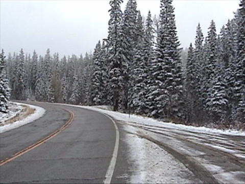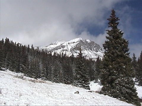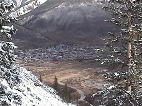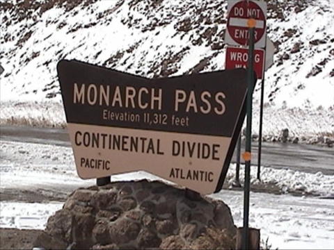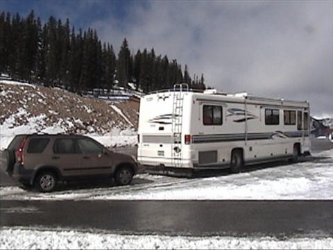 The road ranged from straight and level 65 mph. stretches to 30 mph. very twisty and steep mountain roads. I noticed that most of the speed limits today were definitely too fast for an RV, and probably so for the average car. About an hour out of camp we found a car over the edge, nose down and on its side. We stopped along with someone who had stopped earlier. There had been only a driver in the car, and he was fine. They had called for help about 30 minutes earlier and hoped someone would be by soon to pull the car out. As we headed south-east we were climbing steadily and heading for some very high peaks that were buried in clouds. By the time we reached them, however the clouds were well clear. As we reached 8000 ft. elevation we reached the snow level. This area had snow yesterday as a small front passed through. Once we reached 8000 ft., we never dropped below it until after we left our campground in the Honda. The highlight of the drive was going over Monarch Pass at 11,312 ft. altitude. This is also the Continental Divide. There was a solid blanket of snow everywhere except the roads, which had been cleared. We pulled off into a parking area at the top and parked on about 3 or 4 inches of snow. Even the 31,000 lb. motorhome spun its wheels a little starting up again. Leaving the pass, we dropped 3000 ft. in 10 miles. Our campground is just about at that 10 mile point. We had originally selected the Monarch Spur campground in Poncha Springs, but missed it. In going back to find it, we found another that is not listed in the Trailer Life Campground Directory. We pulled in and asked their rates. It is $17 a night. Our original one was $27 last year, less 10% Good Sam discount. We have full hookups and no amenities - just what we want. After getting settled in, and spending about a half hour and many, many paper towels, I had the windows of the Honda clean enough to safely drive it. It really gets messy towing it on wet roads! Every window on the car was opaque - you could not see out at all! We left camp and headed out highway 50 to Can~on (OK, I don't know how to put the tilde over the n for a pronunciation of "Canyon") City. It was supposed to be about 50 miles, but turned out to be closer to 70. There were a number of interesting sights along the way. After exploring the city, we went back to where we had seen the turnoff for Skyline Drive, and took it. This is a one way, narrow road which is right along the crest of a razorback ridge. Only cars are allowed - no trucks, RV;s or busses. As we followed the 10 foot wide asphalt road and narrow shoulders, the sides dropped at a very steep angle (at least 60 degrees) on both sides. The view was spectacular! The city spread about as far as you could see to the left, while the highway and more mountain ranges dominated the right side. After about 3 miles we dropped down through some very sharp switchbacks into the city. Thursday, Oct. 14