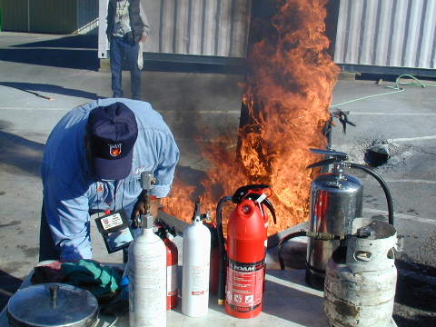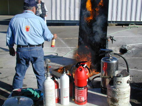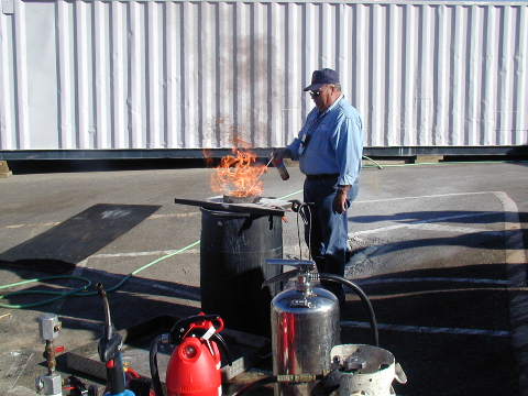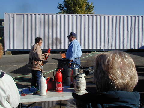 He discussed the various types of fire extinguishers and the classes of fires A, B, C, and D. D is an industrial designation, so only A, B, and C apply to our situations. Type A is wood, fabric,12 volt fires, etc. Basically A is any fire that leaves an Ash (capitalized for mnemonics). He stressed the 12 volt fires here, as statistics show that 70 to 80 percent of RV fires start from 12 volt electrical failures. B fires are flammable liquids such as gasoline, oil, diesel fuel, etc. Type C fires are energized electrical (120 and higher volt) fires. If you unplug a burning appliance (C fire) it then becomes an A fire. The most common type of fire extinguisher in current homes and vehicles is the dry powder. This is quite effective, but really makes a mess! It also only extinguishes the points of the fire that the powder hits, and the powder can pack, requiring you to periodically loosen it by banging the extinguisher. CO2 is very effective indoors, but is useless outdoors if there is any wind. Halon has the same limitation, but it is illegal to manufacture any more halon, so the ones you buy are VERY expensive ($650 or so). For years professional firefighters have used a liquid foam extinguisher. It is very effective, but the foam is toxic, so it has not been offered to the public. In the last couple of years, Kidde, one of the major extinguisher manufacturers has developed a totally non-toxic foam that is now available on the open market. All this sounded very good, but it is hard to imagine just what the differences really are. That is where the last half hour was very informative! Actually we held him for at least 20 minutes overtime. In the back parking lot he had a table set up with a number of extinguishers, a propane bottle, a gasoline can, and several other items on it. Near it was another table next to a steel pan about 2 1/2 or 3 feet square on the ground. He started by selecting a couple of women from the group, gave them each a fire extinguisher and showed them how to use it. He then poured his fuel from the gas can into a skillet. It really was a mixture of diesel fuel and gasoline. He lit it and had the women, in turn extinguish it using powder. It worked great, but left a lot of white residue on all the surroundings and a massive cloud in the air. He then in turn did a couple more fires in the pan, then in the square pan on the ground. This produced a very roaring fire! He then slid a piece of plywood at least 6 feet high into clips on the pan. He would pour fuel on the board, then in the pan and light it. He or the women put out each fire with different extinguishers. When he used the foam, he really made a believer of me! He could hit just part of the fire and in a few seconds the entire fire went out. The foam flows towards the fire, therefore you don't have to be nearly as careful to hit every little place where there is flame. Another advantage of the foam is that it is an emulsifier. After it kills the fire, the foam will pull out any oil or fuel and essentially turn it into soap. After putting out the pan fire one of the times, he sloshed his hands in the remaining liquid and made the rounds letting each of us touch our thumb and forefinger to the white foam on his hand. It felt soapy and smelled very fresh. There was no fuel smell at all! I ended up buying 4 foam extinguishers for our motorhome and toad. He recommends a total of 5. A large one by the front door, accessible from inside or out, a small one each in the bedroom, kitchen, and in your towed car. The 5th one should be in an outside compartment. This can be your existing powder unit. Powder is somewhat more effective on propane fires than the foam. After thinking about it we decided to go back and get 3 more for our house! I made a quick tour of the new coaches for sale. It is interesting to see all the glitz and glitter some of them offer, but I didn't see any I would change for ours! Betty and I then went into town and had lunch/dinner at Johnny Carrino's Italian restaurant. They offered a discount to rally attendees. This evening's entertainment was by Bill White. He is a nephew of Jim Reeves, and has a wonderful voice. Jim was killed in a plane crash 40 years ago. Bill did a tribute to Jim Reeves, but also sang many well known songs from other artists. He mentioned that after this show, he had to be back at work tomorrow evening. He later mentioned that he worked his regular job Sundays. He is a Baptist preacher! I bet that church has some great music! We thoroughly enjoyed this show, which was the last event of this rally. We head for home tomorrow morning and will go as far as Winslow, AZ. We should be home Monday morning. Thanks so much for traveling with us. I look forward to writing about our next trip. See you then. With love, Dick and Betty