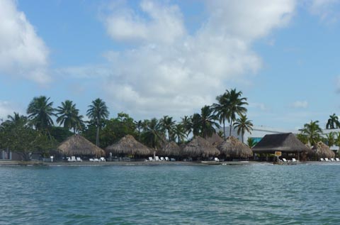 This is a commercial beach with grass roofed cabanas and lounge chairs.