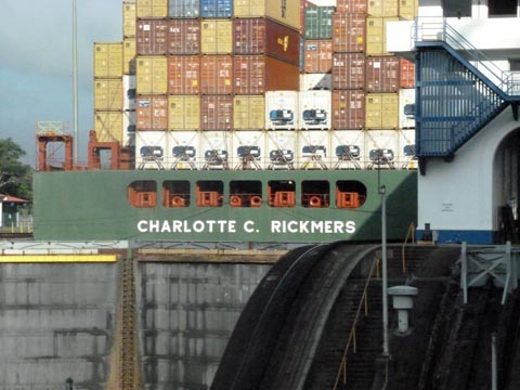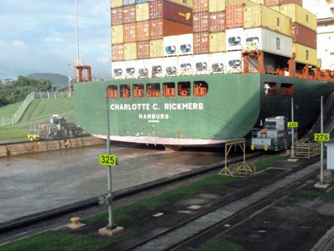 wide by two locks long. There is a container ship just entering